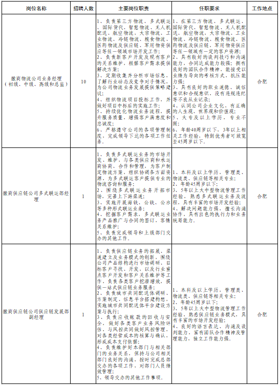 徽商物流公司业务经理岗位联系人:刘女士 0551-64329026