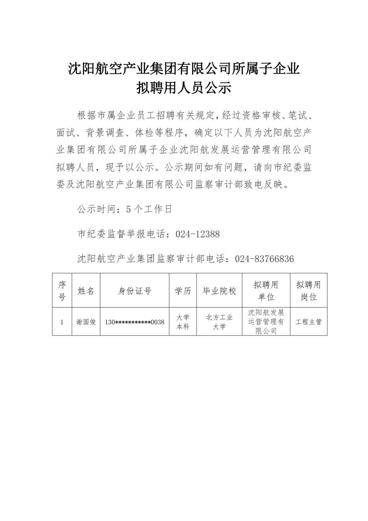 沈阳航空产业集团有限公司所司子企业拟聘用人员公示