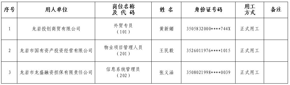 根据2025年1月3日发布的《龙岩投资发展集团有限公司所属企业关于公开招聘(遴选)工作人员的公告》有关要求,经报名、资格审查、组织考试、体检、考察等程序,现将龙岩投创商贸有限公司外贸专员(岗位代码101)等3个岗位拟录用人员名单公示如下: