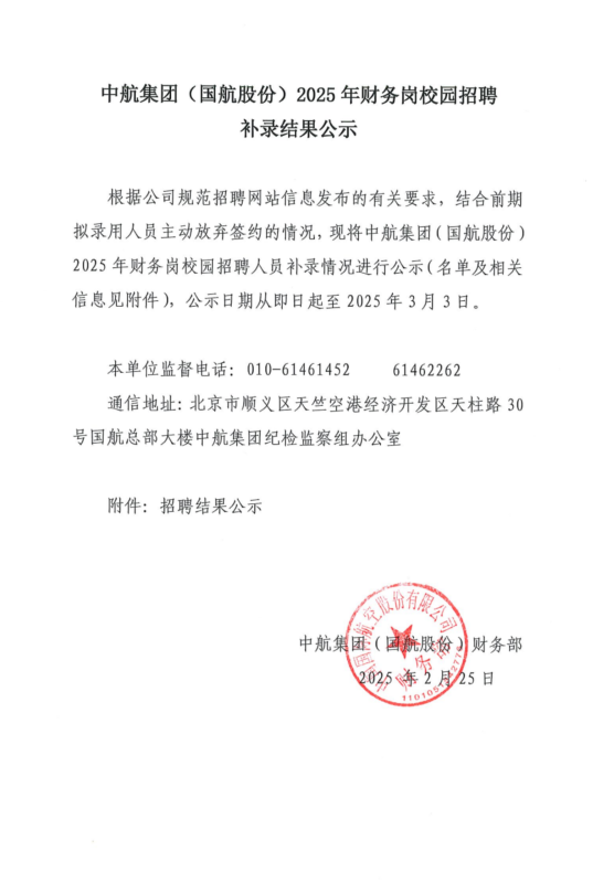 中航集团(国航股份)2025年财务岗校园招聘补录结果公示