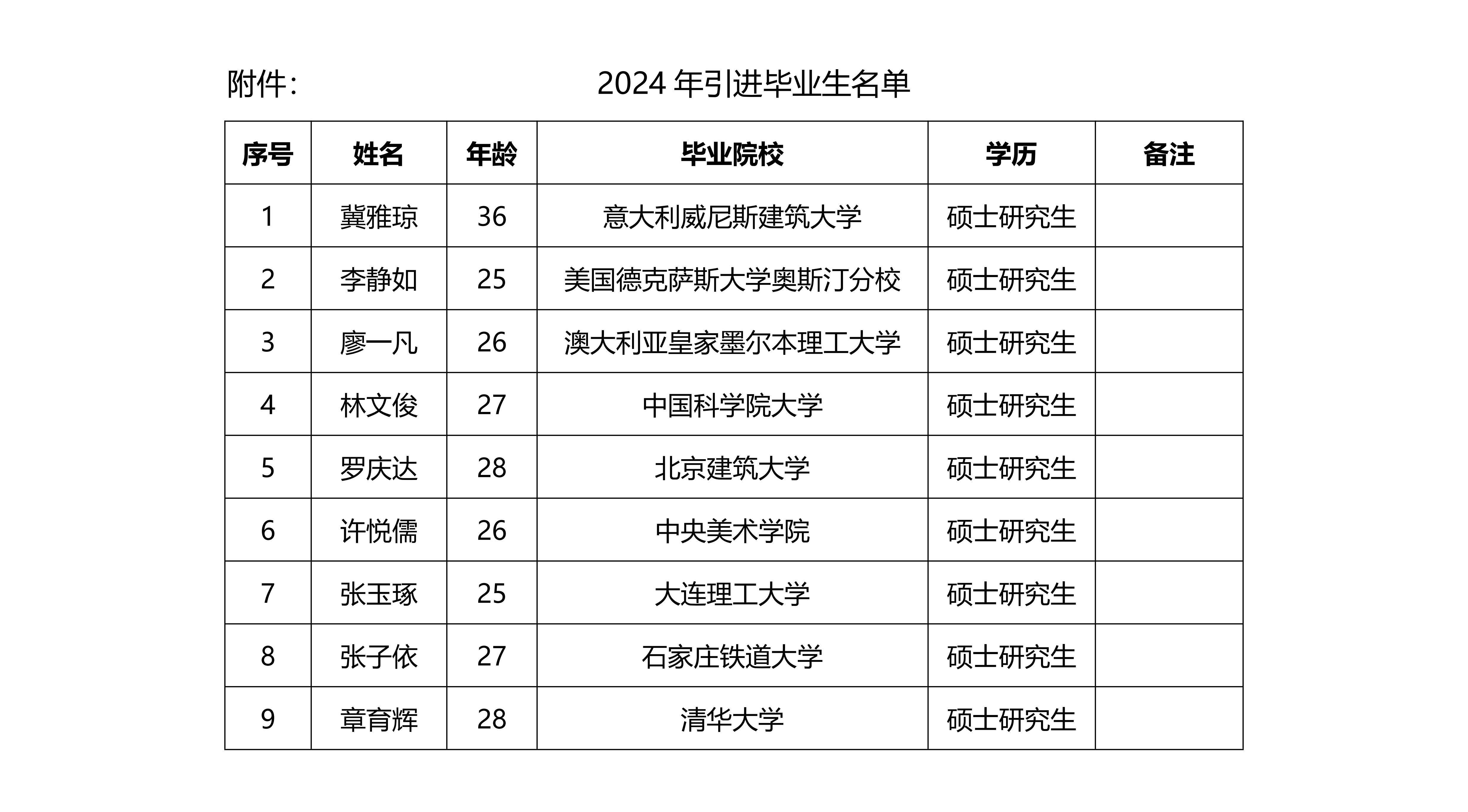 为广泛接受社会监督,确保引进毕业生工作信息公开,在发布2024年度校园招聘公告后,经个人报名、高校推荐、资格审查、笔试测评、部门面试、政审体检等环节,经公司研究,我单位2024年引进毕业生9名(名单附后),现予以公示。