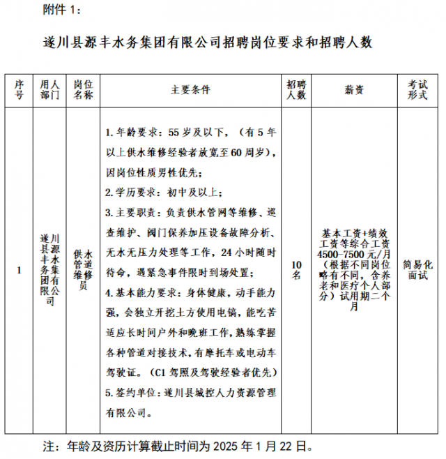 遂川县源丰水务集团有限公司是一家以城乡供水和污水处理为主营业务,同时具备市政、水利、环保、机电、消防建筑资质和业务承建能力的县国有企业,因工作需要和事业发展需求,委托我公司面向社会公开招聘10名供水管道维修员,现将有关事项公告如下: