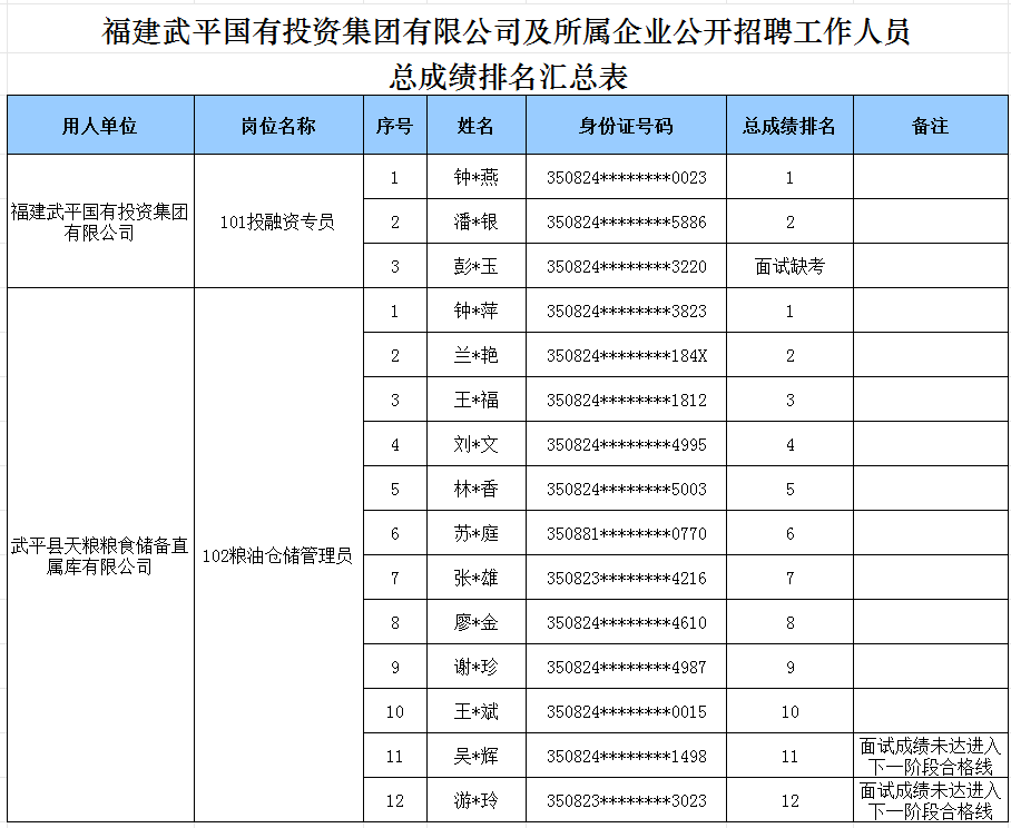 根据2024年12月18日发布的《福建武平国有投资集团有限公司及所属企业关于公开招聘工作人员的公告》及2025年1月14日发布的《福建武平国有投资集团有限公司关于公开招聘工作人员延期报名的补充公告》有关要求,福建武平国有投资集团有限公司投融资专员(岗位代码101)等2个岗位考试(笔试+面试)环节已经我司组织完成,现将总成绩排名予以公示。
