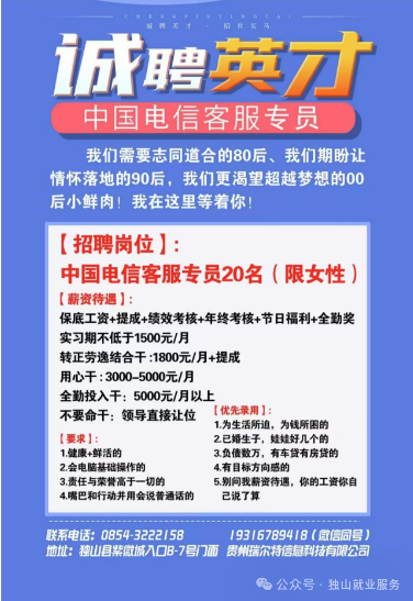 标签: 贵州瑞尔特信息科技有限公司 中国电信客服 招聘信息 客服专员 信息技术