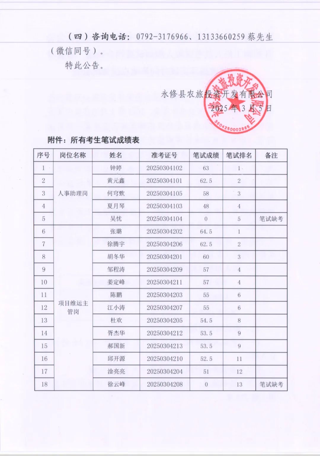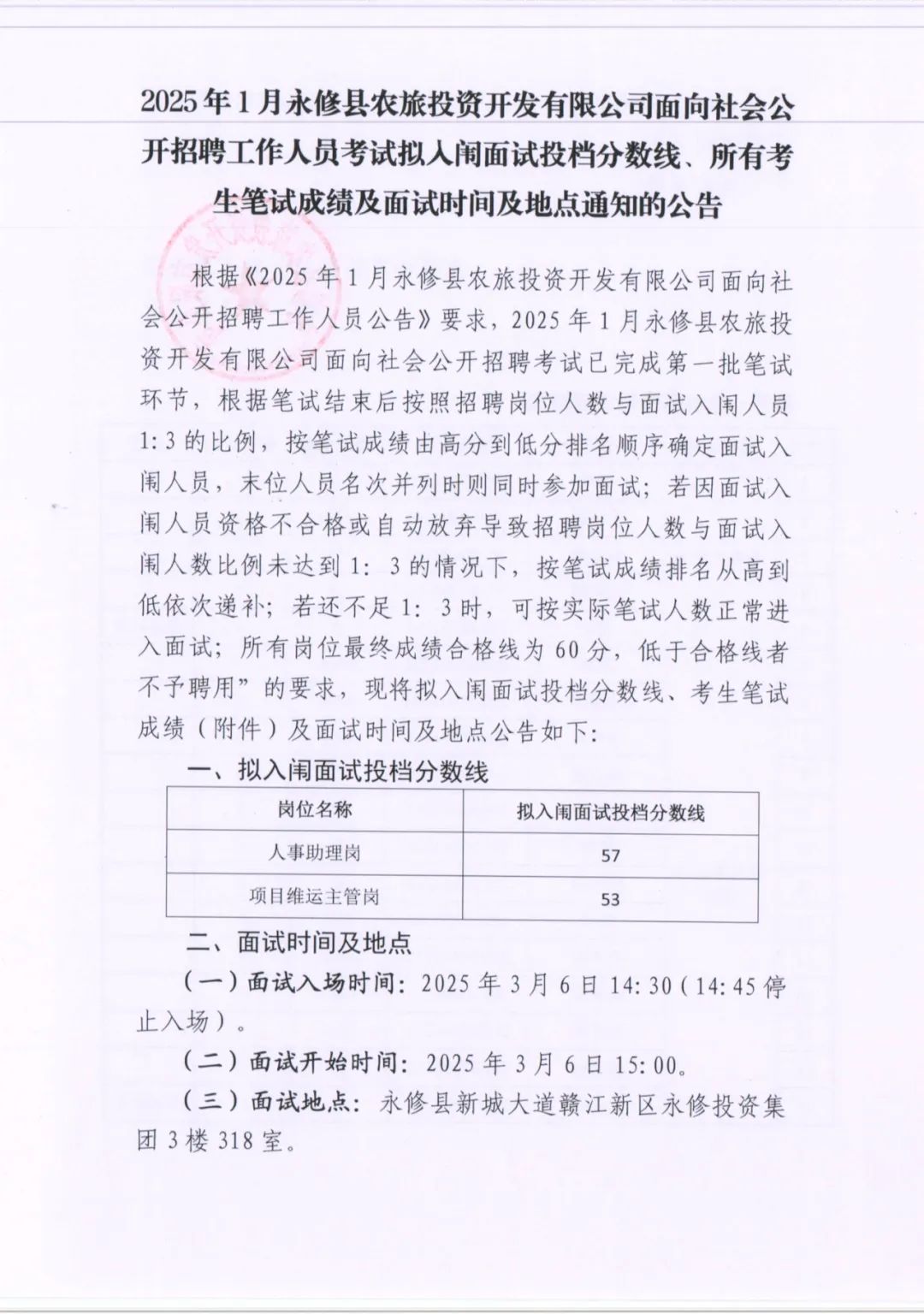 2025年1月永修县农旅投资开发有限公司面向社会公开招聘工作人员考试拟入闱面试投档分数线、所有考生笔试成绩及面试时间地点通知公告
