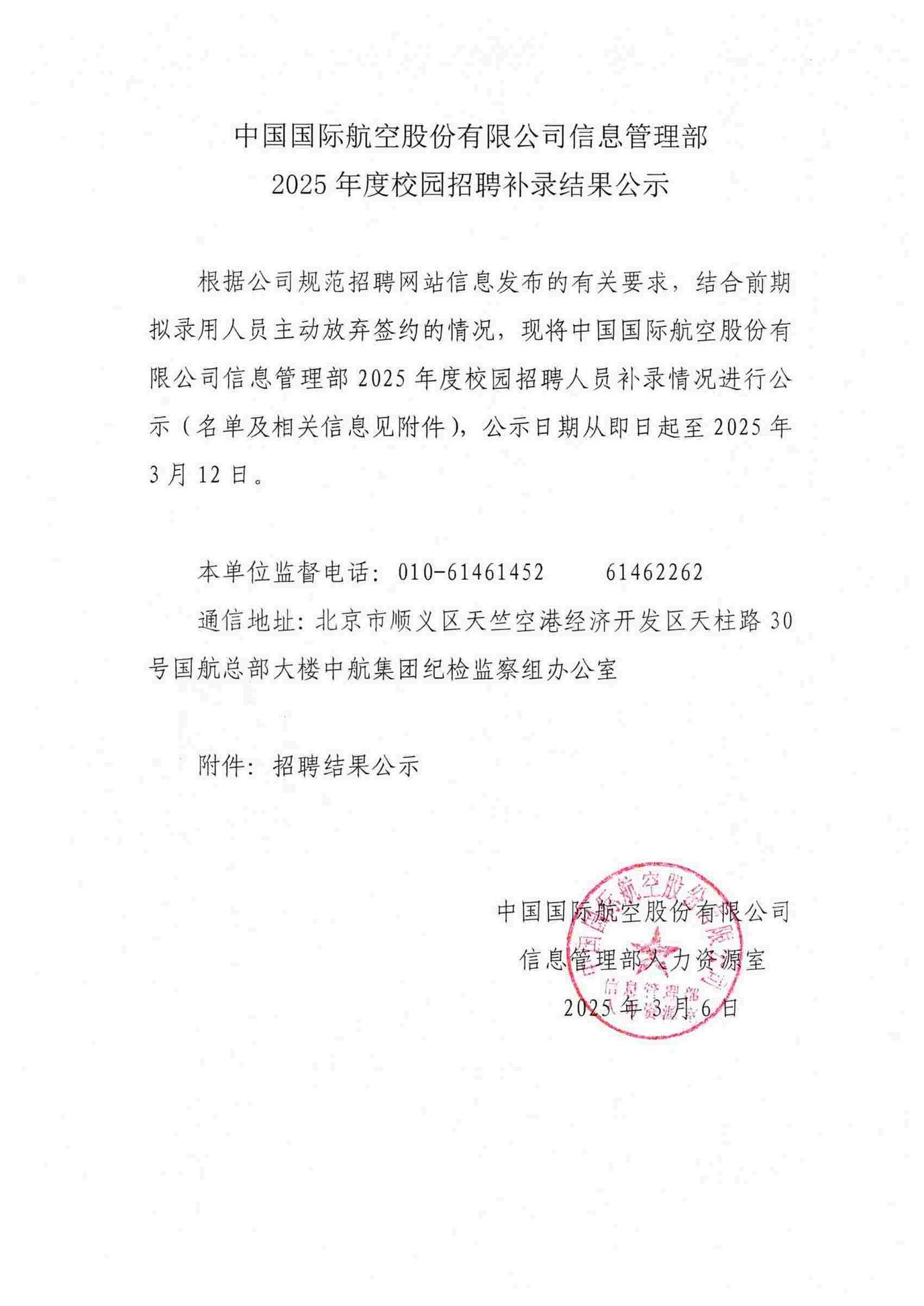 中国国际航空股份有限公司信息管理部2025年度校园招聘补录结果公示