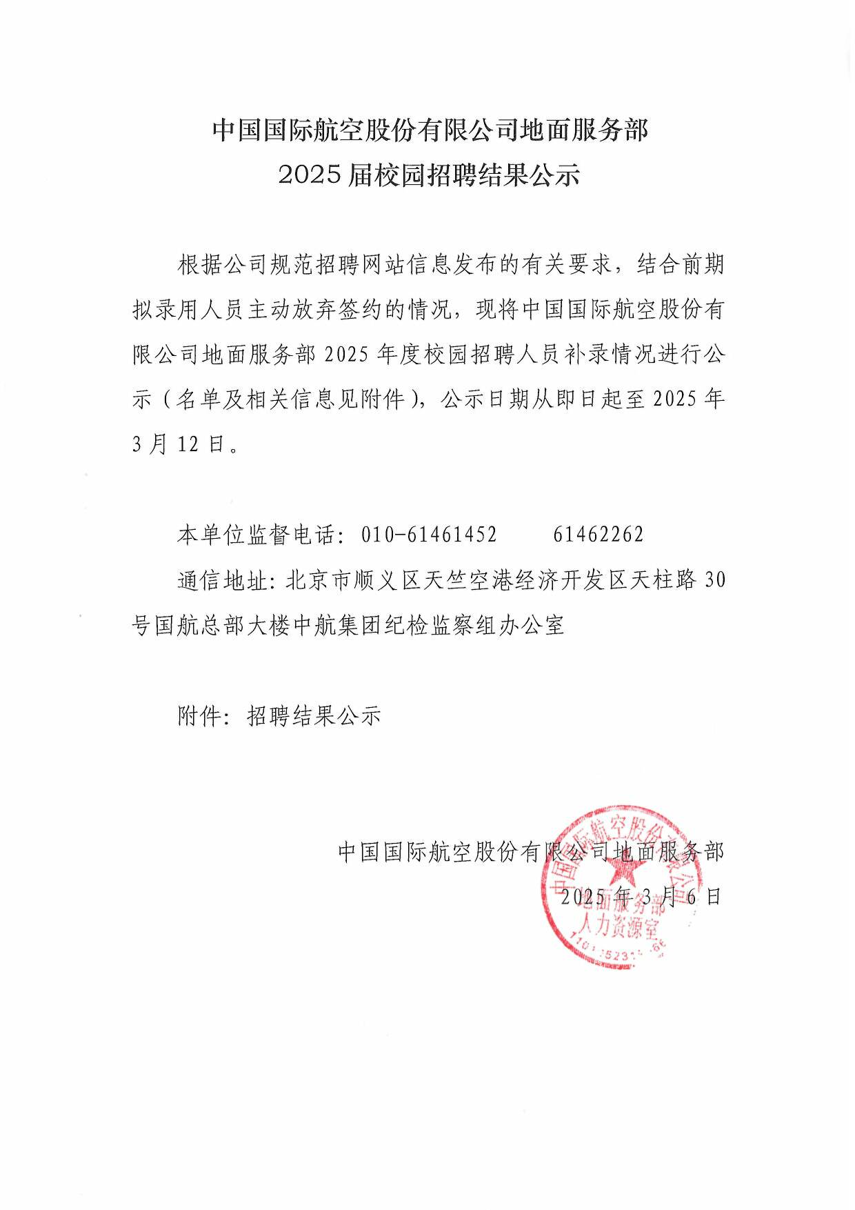 中国国际航空股份有限公司地面服务部2025届校园招聘结果公示