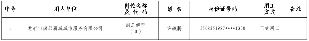 根据2024年12月30日发布的《龙岩市南部新城发展集团有限公司所属企业关于公开遴选管理人员的公告》有关要求,经报名、资格审查、组织考试、体检、考察等程序,现将龙岩市南部新城城市服务有限公司副总经理(岗位代码101)拟录用人员名单公示如下: