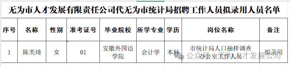 标签: 无为市人才发展有限责任公司 无为市统计局 招聘工作人员 拟录用人员名单 人才招聘