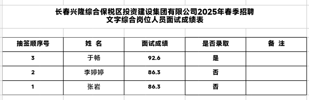 ?长春兴隆综合保税区投资建设集团有限公司面试成绩及拟录用人员(详见附件)公示,公示期自2025年3月24日至2024年3月26日,公开接受社会监督,个人审查贯穿整个招聘过程,如发现不符条件者即时取消录取资格,监督举报电话:0431-81880016。
