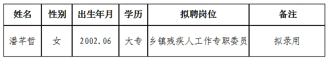 受淳安县残联委托,浙江雷博人力资源开发有限公司淳安分公司面向社会公开招聘1名工作人员,派遣至乡镇残联开展残疾人工作,经公开报名、笔试、面试、体检和考察,现将拟聘用的1名乡镇残疾人工作专职委员予以公示。