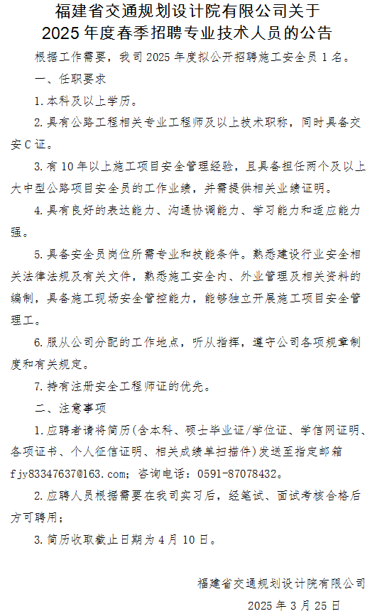 已结束 【合同制】福建省交通规划设计院有限公司关于2025年度春季招聘专业技术人员的公告(招若干人,03月28日~04月12日报名)
