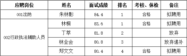 根据3月7日发布的《福鼎市交通运输综合执法大队2025年公开招聘劳务派遣工作人员的公告》有关要求,因有考生放弃入职,按照面试成绩排名顺序依次递补。通过报名、资格审查、考试、体检等程序,现将各岗位拟聘用人员予以公示: