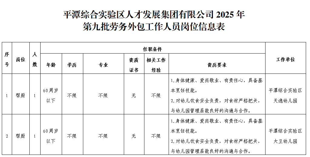 1.详见《平潭综合实验区人才发展集团有限公司2025年第九批劳务外包工作人员岗位信息表》(附件1)。
