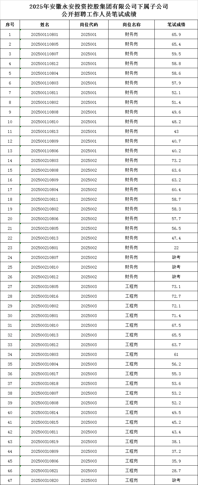 根据《2025年安徽永安投资控股集团有限公司下属子公司公开招聘工作人员公告》要求,现将笔试成绩公示如下: