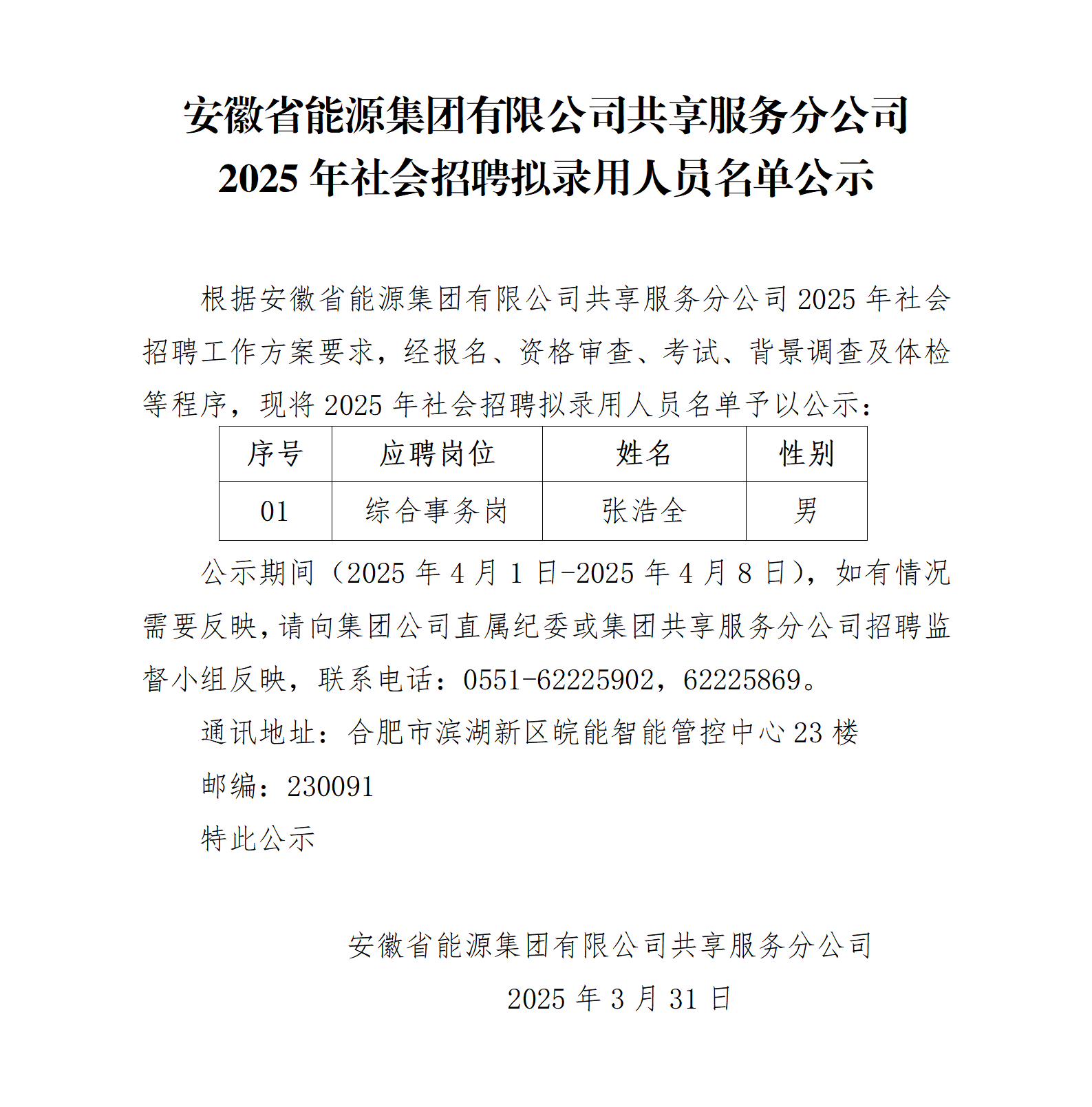 安徽省能源集团有限公司共享服务分公司2025年社会招聘拟录用人员名单公示