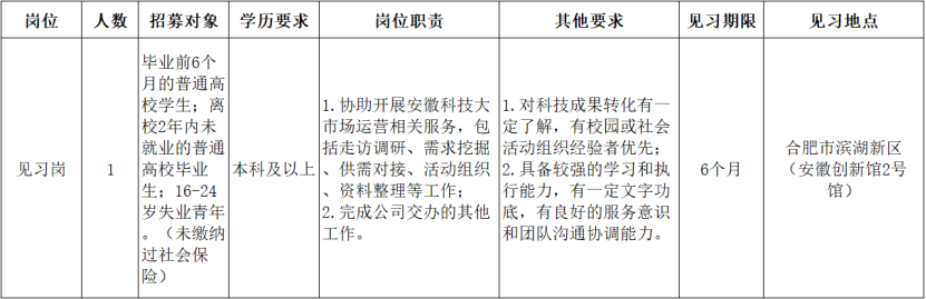 因工作需要,经安徽科技大市场建设运营有限责任公司研究决定,委托安徽皖信人力资源管理有限公司公开补充招募1名见习人员。现就有关事项公告如下: