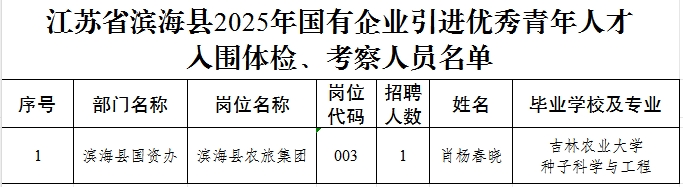 根据《江苏省滨海县2025年国有(民营)企业引进优秀青年人才公告》规定,经资格审核、综合素质评价、面试,现公布003岗入围体检、考察人员名单(附后)。体检、考察时间地点另行通知,请入围考生保持通讯畅通。