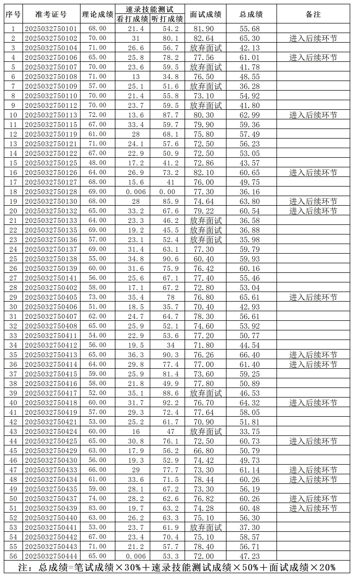 按照《泉州中院招聘市聘司法辅助人员的公告》的相关要求,经过笔试、速录技能测试、面试等环节,现将总成绩及进入后续环节人员名单予以公布(见附件)。心理风险测试及体检的时间和地点将另行通知,体检费用由考生承担。