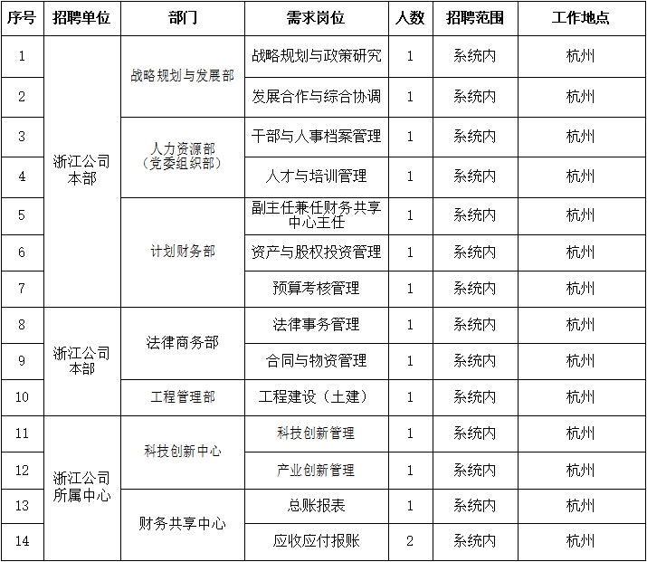 现根据工作需要,招聘浙江公司本部及所属中心管理岗位,有关事项公告如下: