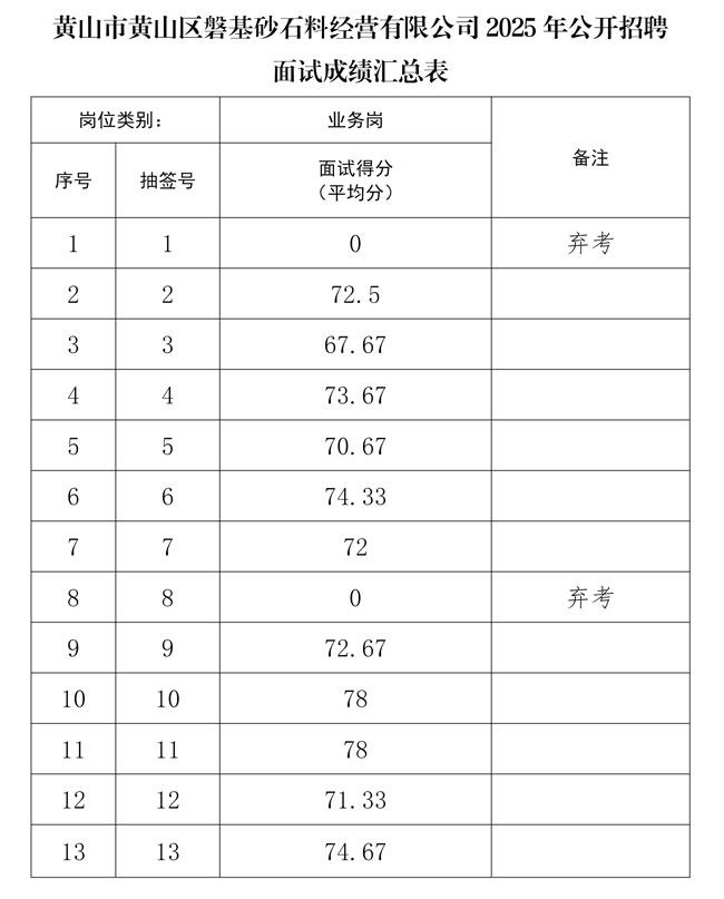 根据《黄山市黄山区磐基砂石料经营有限公司招聘工作人员公告》规定,黄山市黄山区磐基砂石料经营有限公司2025年公开招聘工作人员面试已于4月10日完成,现将面试成绩予以公示。