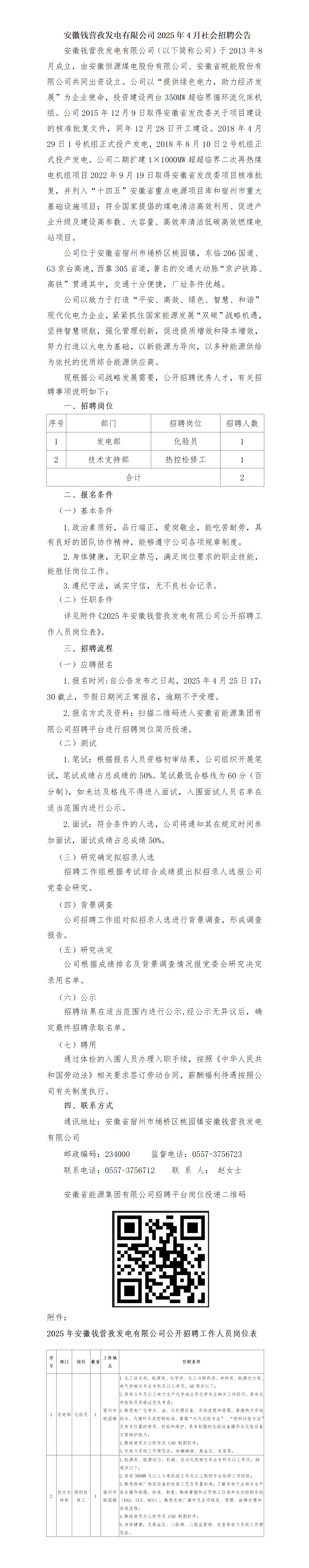 已结束 【合同制】安徽钱营孜有限公司2025年4月社会招聘公告(招若干人,04月14日~04月29日报名)