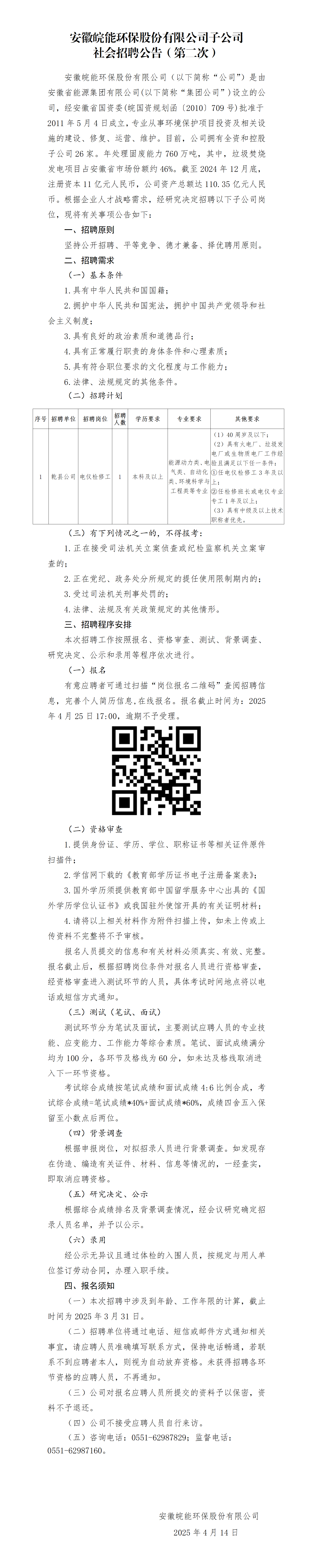 已结束 【合同制】安徽皖能环保股份有限公司子公司社会招聘公告(第二次)(招若干人,04月14日~04月29日报名)