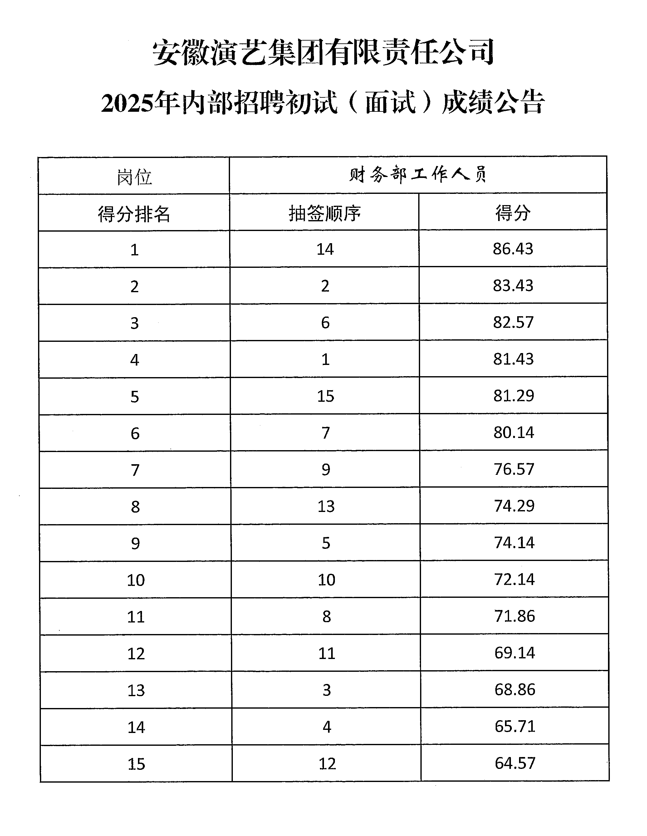 安徽演艺集团有限责任公司2025年内部招聘初试(面试)成绩公告