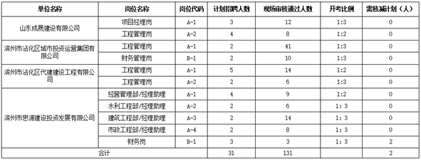 根据《滨州市思源建设投资发展有限公司2025年公开招聘工作人员简章》、《山东成晟建设有限公司2025年公开招聘工作人员简章》、《滨州市沾化区城市投资运营集团有限公司、滨州市沾化区代建建设工程有限公司2025年公开招聘工作人员简章》中第三部分第三条中相关要求和规定。资格审核工作结束后,对应聘人数达不到1:3比例的岗位,计划招聘1人的,取消招聘岗位;计划招聘2人(含)以上的,按规定的比例相应核减计划。对达不到规定比例的招聘岗位,经招聘领导小组批准,可适当降低开考比例至1:2。现将本次开考比例调整和计划核减的情况公告如下: