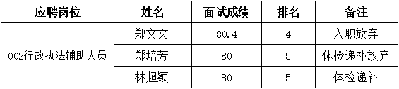 因002行政执法辅助人员岗位有考生放弃入职,按照面试成绩排名顺序依次递补,递补名单如下: