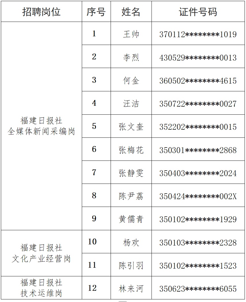 根据《2025年福建日报社(福建日报报业集团)公开招聘高层次人才方案》要求,经公开报名、资格复审,现将进入面试人选予以公布(名单附后)。