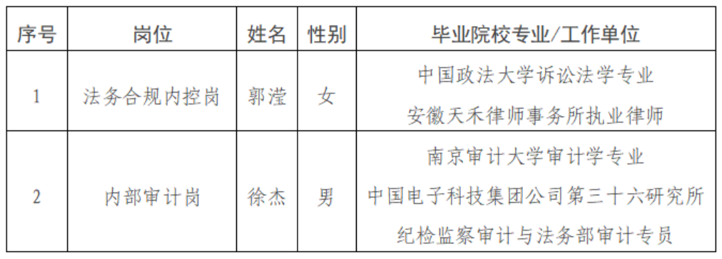 根据安徽国控资本有限公司2025年社会招聘工作方案及招聘程序,经研究,现将拟录用人员信息进行公示: