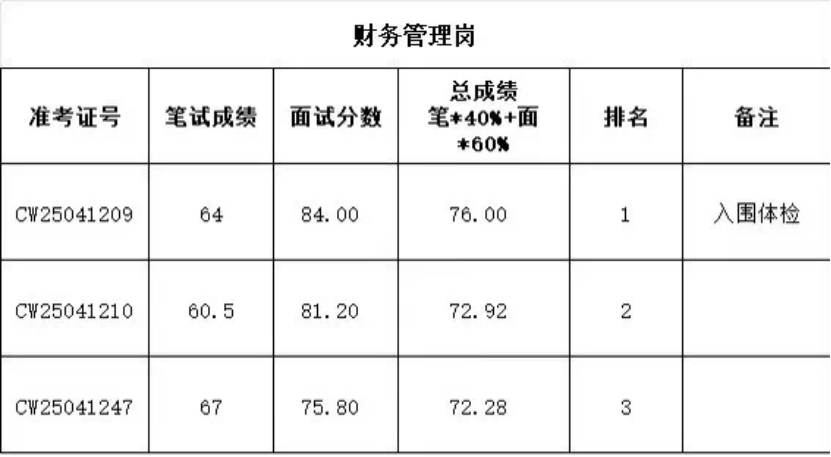 嘉兴市南湖城市建设投资集团有限公司公开招聘工作人员于2025年4月19日完成面试考试,根据招聘程序和办法,现将总成绩和入围体检情况予以公布。