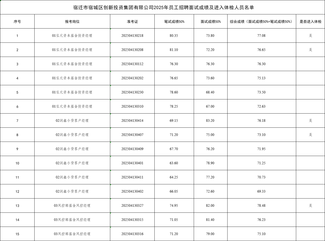 根据《宿迁市宿城区创新投资集团有限公司2025年员工招聘简章》有关要求,现将体检有关事项公告如下。