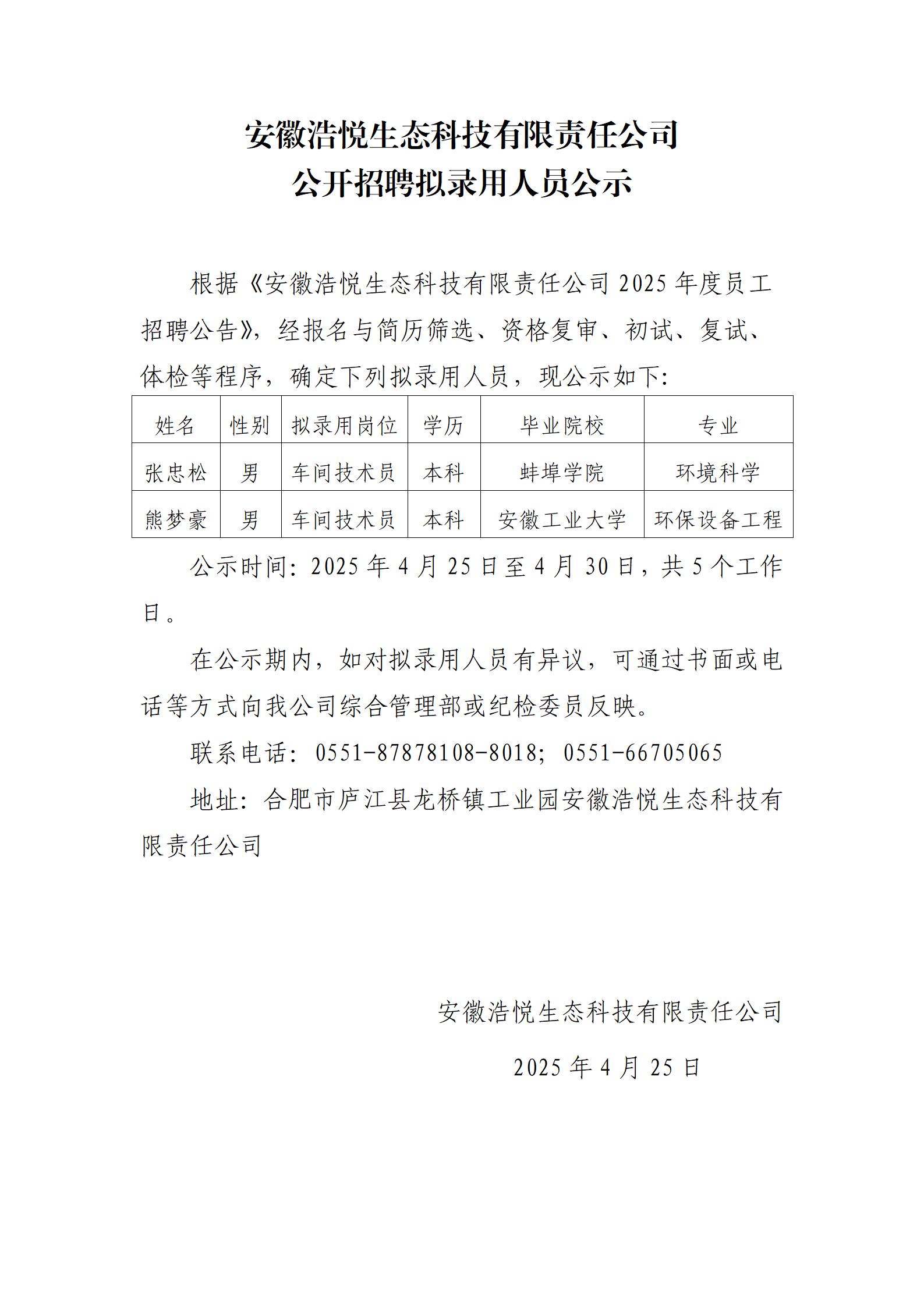 安徽浩悦生态科技有限责任公司公开招聘拟录用人员公示