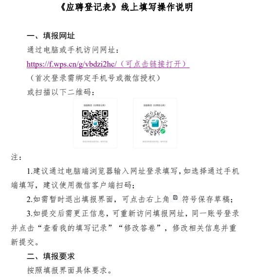 (1)请登录报名系统线上填写《应聘登记表》,电脑或手机访问网址:https://f.wps.cn/g/vbdzi2hc/或扫描以下二维码填写: