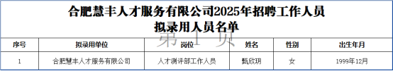 根据《合肥慧丰人才服务有限公司2025年招聘工作人员公告》(2025-03-31)的规定,公开招聘工作按照网上报名与资格初审、资格复审、面试、体检与考察等环节,考生甄欣玥符合条件,作为拟录用人员,现予以公示。