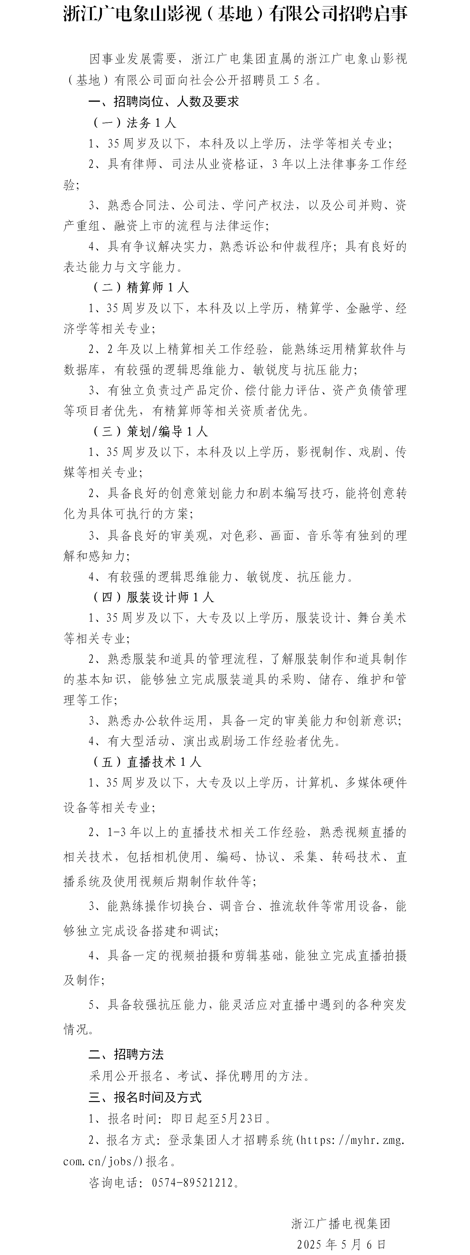 已结束 【合同制】社会招聘|浙江广电象山影视(基地)有限公司招聘启事(招若干人,05月06日~05月21日报名)