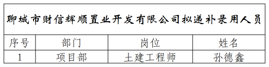 根据《聊城市财信辉顺置业开发有限公司招聘公告》规定,我公司于2025年4月28日对拟录用人员进行了公示。在公示期间,土建工程师岗位拟录用人员向我公司提交了放弃入职的书面说明。鉴于公司当前用人需求及岗位实际情况,经严格履行相关程序,现决定依据面试成绩对土建工程师岗位进行递补录用。现将聊城市财信辉顺置业开发有限公司拟递补录用人员名单予以公示。
