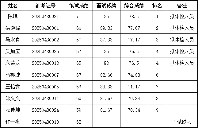 根据4月25日发布的《福鼎国企︱某国企低压综合服务员》有关要求,综合成绩按笔试成绩占50%、面试成绩占50%的比例折合计算,现将考生综合成绩公告如下: