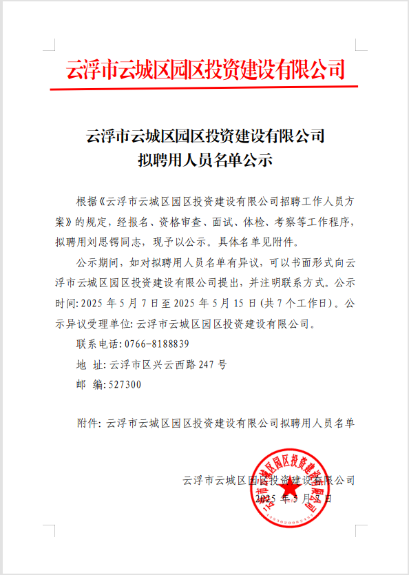 云浮市云城区园区投资建设有限公司拟聘用人员名单公示