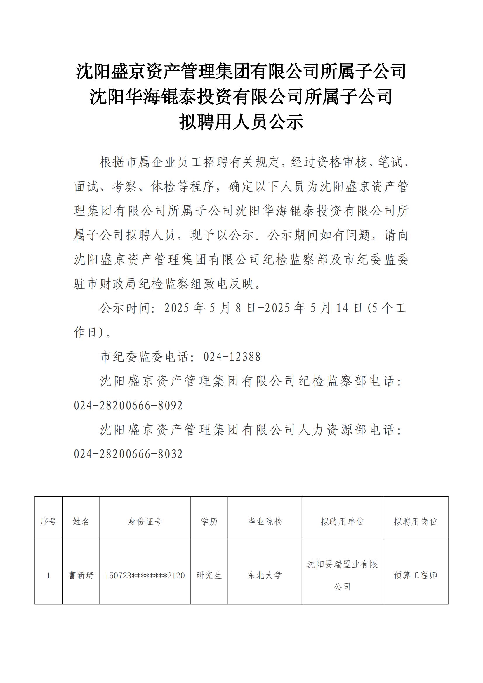 沈阳盛京资产管理集团有限公司所属子公司沈阳华海锟泰投资有限公司所属子公司拟聘用人员公示
