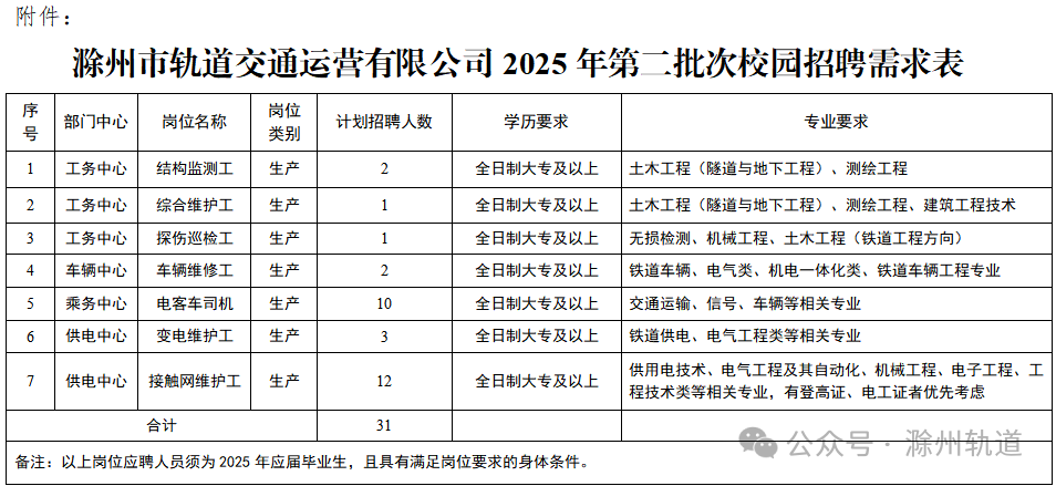 滁州市轨道交通运营有限公司于2021年8月30日成立,负责滁州市轨道交通运营维护管理。为满足运营工作需要,经与南京地铁公司充分协商,参照南京地铁招聘流程,与南京地铁公司共同开展校园招聘工作。现面向全国院校公开招聘7个校招岗位,欢迎符合岗位要求、专业对口、有志于共谋滁宁城铁运营发展的优秀人才,加盟滁宁城铁运营大家庭。