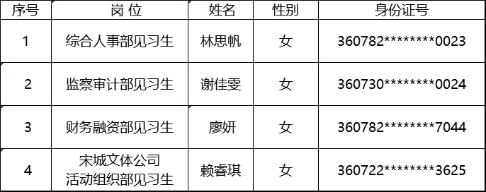 根据《赣州市章贡区文化旅游发展集团有限公司2025年见习生招聘公告》要求,经过报名、资格审查、面试等程序,我司按照应聘人员的面试成绩由高到低排名,最终确定4名见习生拟录用人员,现予公示。