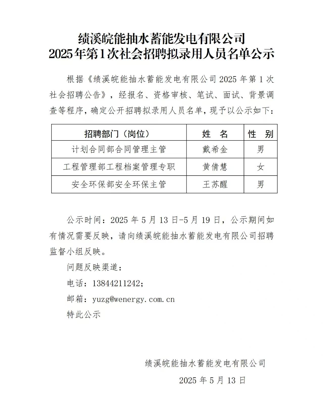 绩溪皖能抽水蓄能发电有限公司2025年第1次社会招聘拟录用名单公示