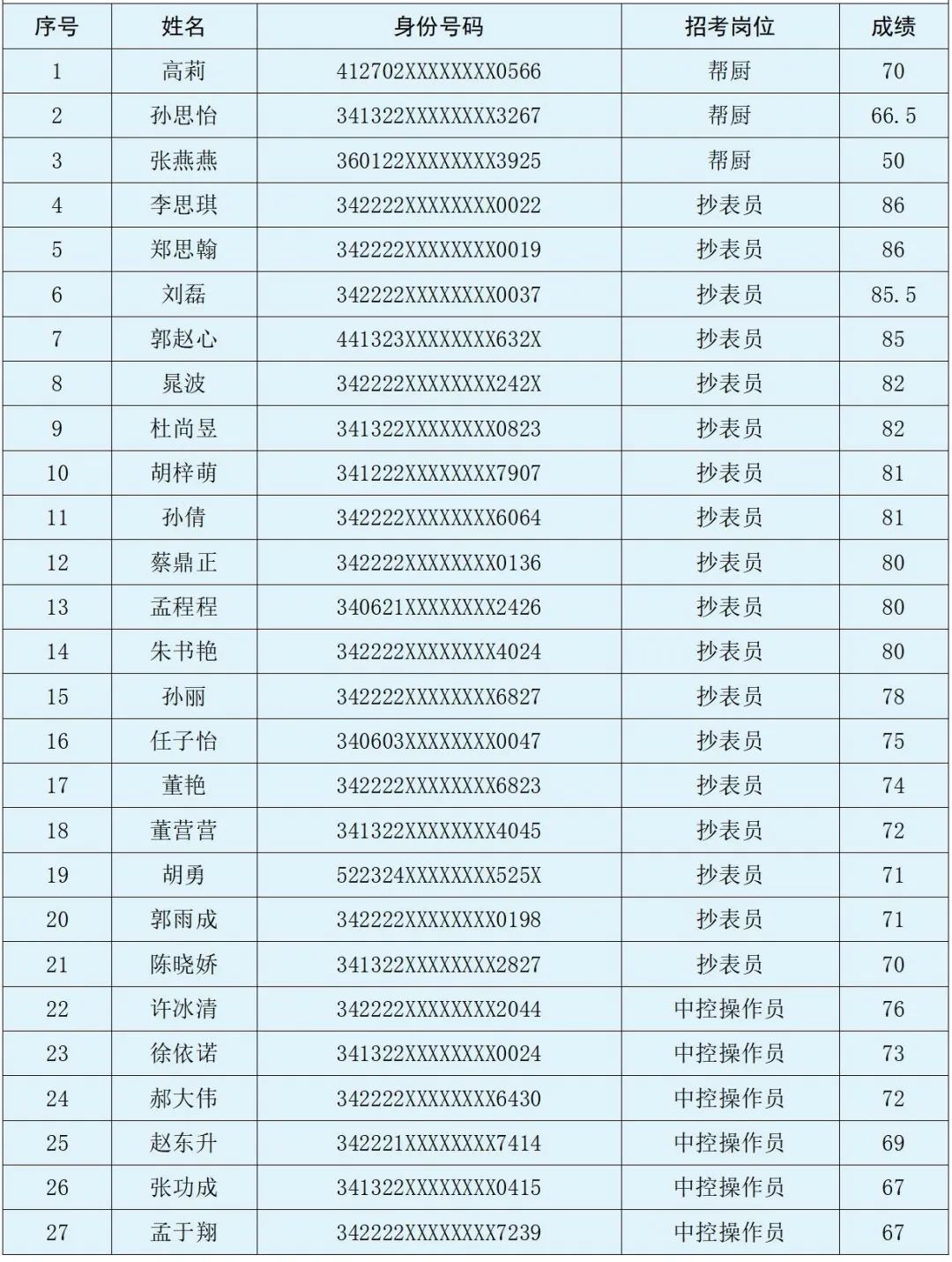 萧县云水水务社会招考笔试阅卷评分和统分工作已按计划完成,根据笔试成绩由高到低确定入围人员,入围比例按照计划招考人数1:3比例确定。现公布各岗位考试入围人员名单及分数。请入围人员保持通信畅通,我司将以短信、电子邮件方式通知参加面试相关事宜。公示时间2025年5月13日至2025年5月18日。