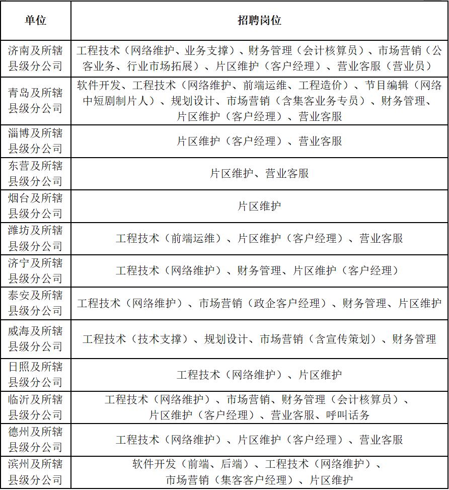 中国广电山东网络有限公司(原山东广电网络有限公司,成立于2001年,2021年6月更名)是中央大型文化企业中国广电网络股份有限公司的控股子公司,主要负责山东省内广播电视网络和智慧广电业务的规划、建设、运营和管理,广播电视节目制作、编辑、采集、经营及广播电视节目传送业务等,拥有32万公里有线电视传输干线和5G 700M、4.9GHz 频谱、192号码段等资源,作为新型广电媒体传播网、国家文化专网、国家新型基础设施网和重要战略资源网,是舆论宣传主渠道主阵地和综合文化信息服务商。目前,公司下辖16家市级公司,138家县(市、区)公司和19家控股子公司。公司用户总量和经营总量位居全国前列,已建成覆盖省市县乡村五级的有线传输网络和统一智能的技术平台,拥有直到村一级的服务体系。公司两次荣膺全国“文化企业30 强”,荣获“全国文化体制改革先进单位”、山东省“省级文明单位”、“重合同守信用企业”等荣誉称号。为适应事业发展需要,进一步优化公司人才队伍结构,本着“公开、平等、竞争、择优”的原则,招聘市、县公司工作人员,具体事宜如下: