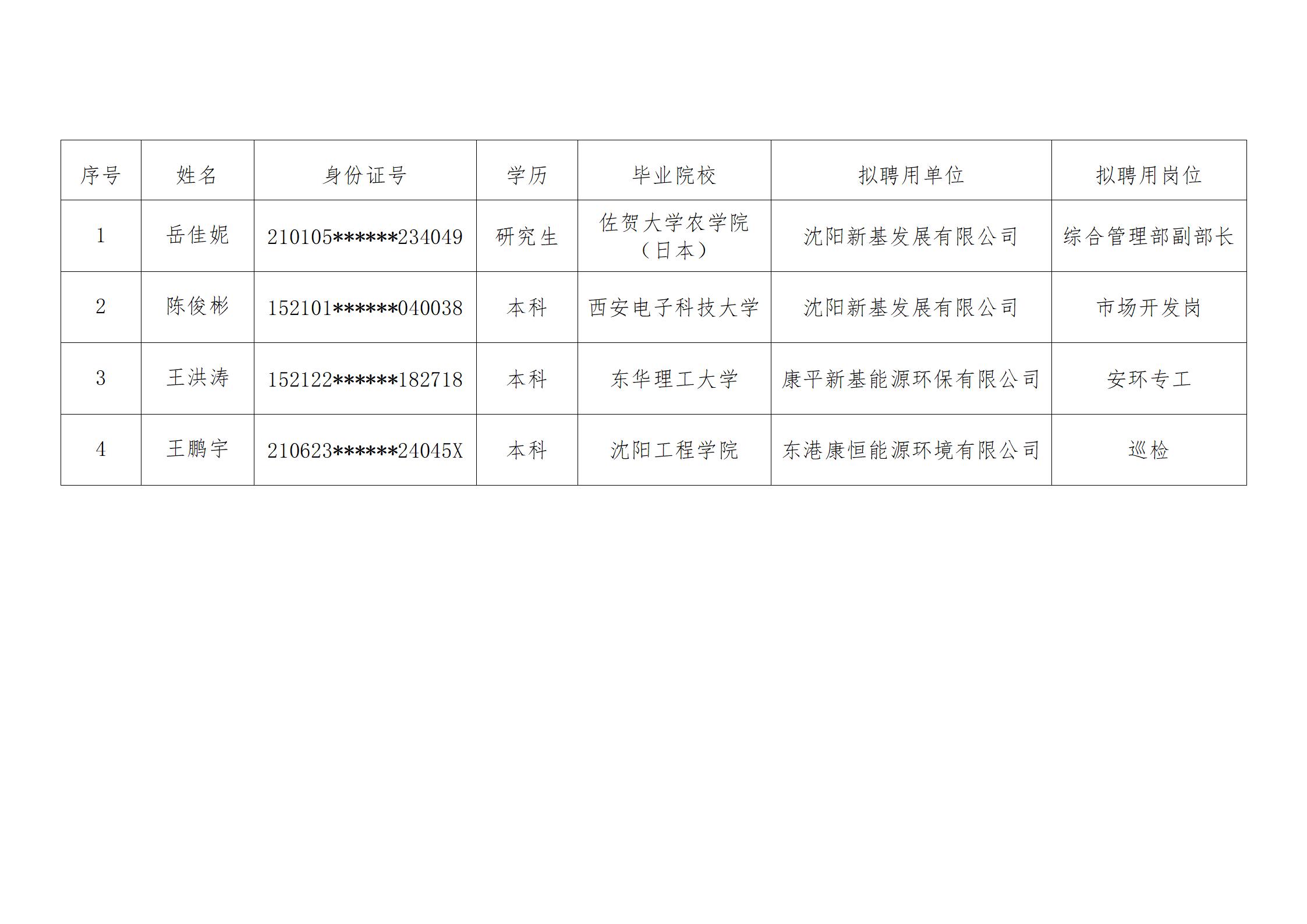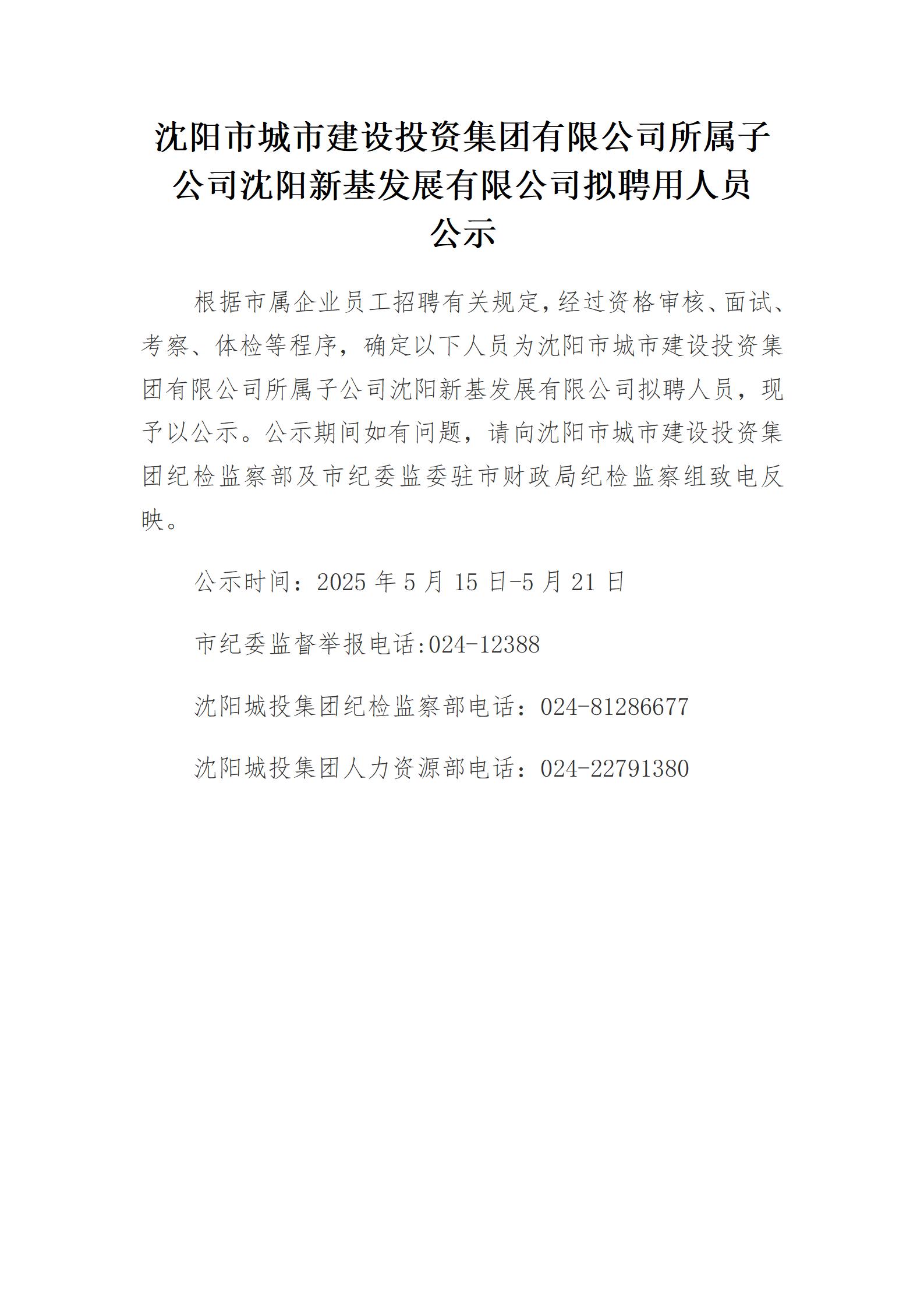 沈阳市城市建设投资集团有限公司所属子公司沈阳新基发展有限公司拟聘用人员公示