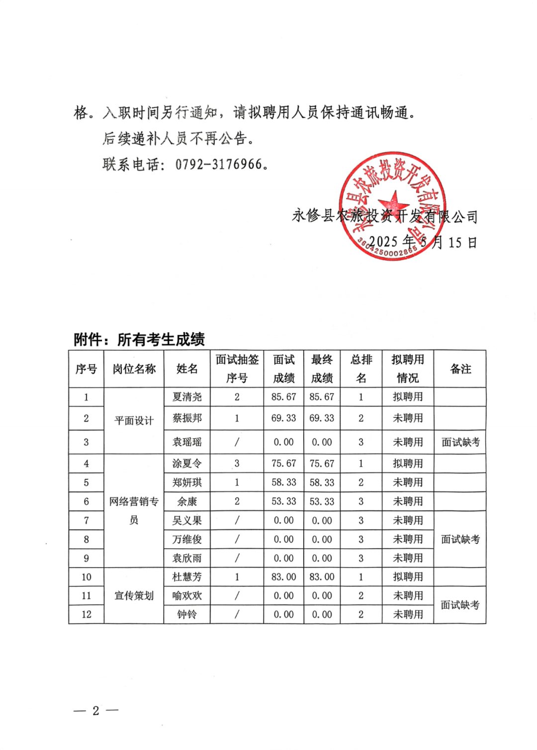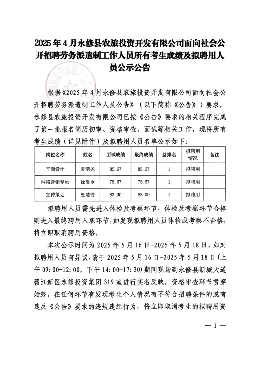标签: 永修县农旅投资开发有限公司 2025年4月招聘 劳务派遣制工作人员 招聘成绩 拟聘用人员公示 公开招聘公告