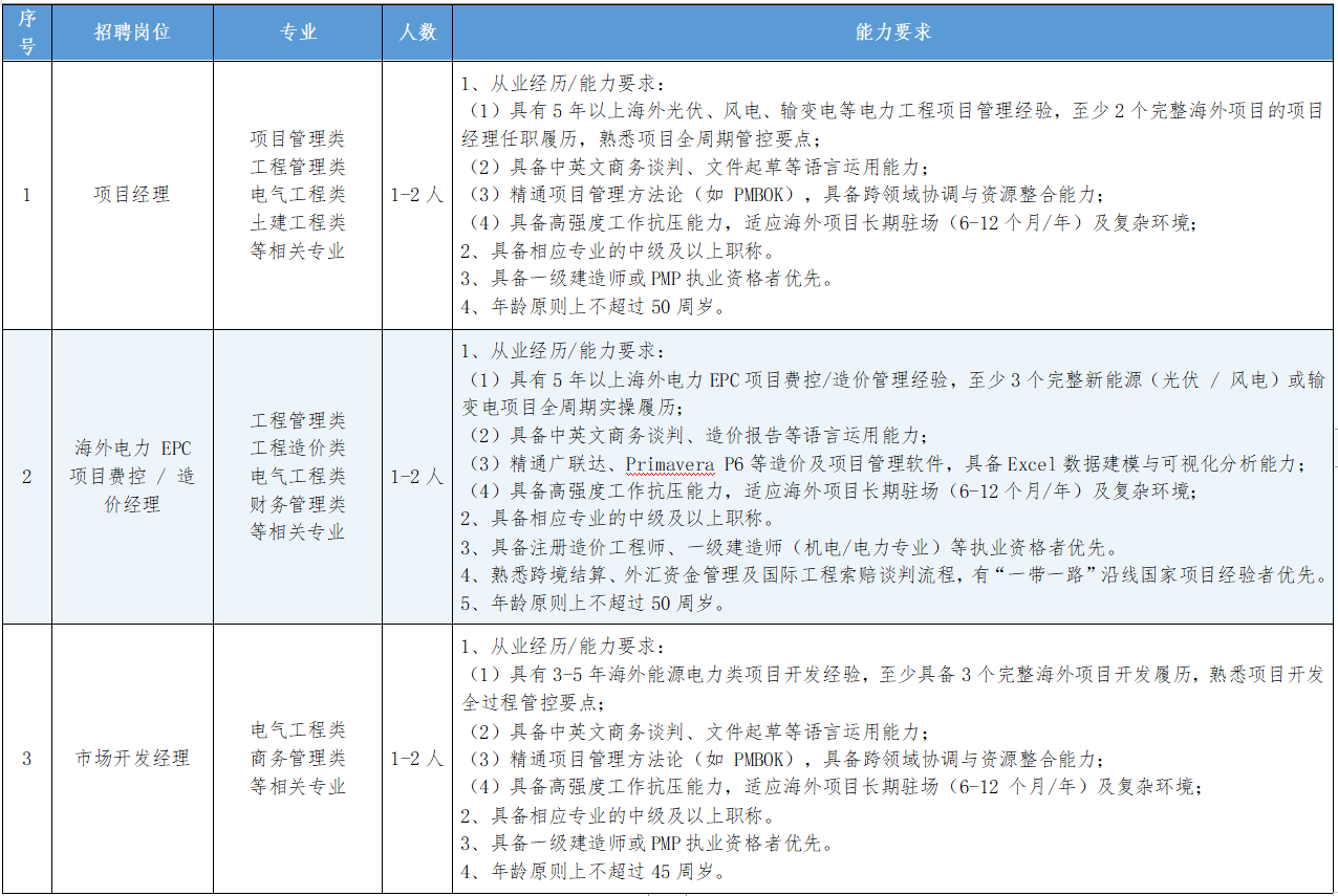 为打造具有国际影响力的能源电力与基础设施一体化解决方案服务商,因工作需要,现面向社会公开招聘从事国际相关专业人才,具体事项公告如下: